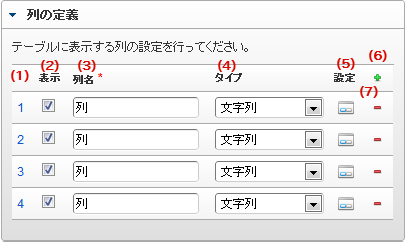 列の表示/非表示を設定します。チェックがオフの場合、列は画面に表示されませんが、値の設定・取得等に利用することができます。タイプが「隠しパラメータ」の場合、必ずチェックがオフ(非表示)になります。