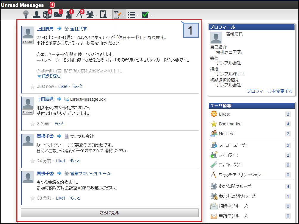 ログインユーザのMyBoxで未読状態となっているメッセージのみを表示します。投稿内容はメッセージ形式にて表示されます。