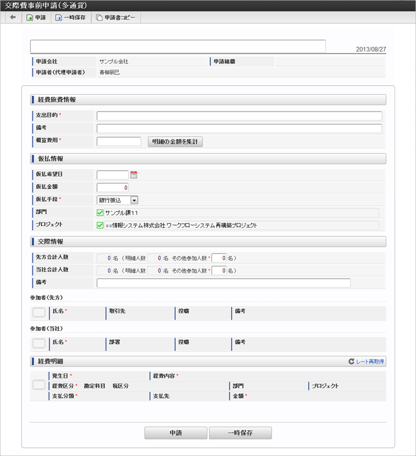 申請会社、申請組織、申請者の名称取得の基準日は、検索基準日です。一時保存後に申請基準日を変更した場合でも変更されません。 経費旅費情報(概算費用あり)