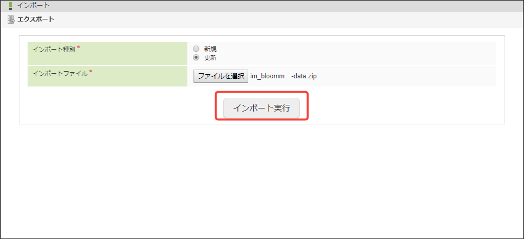 - 更新:全ての情報のインポートを行います。インポート対象の情報が存在する場合、上書きされます。
