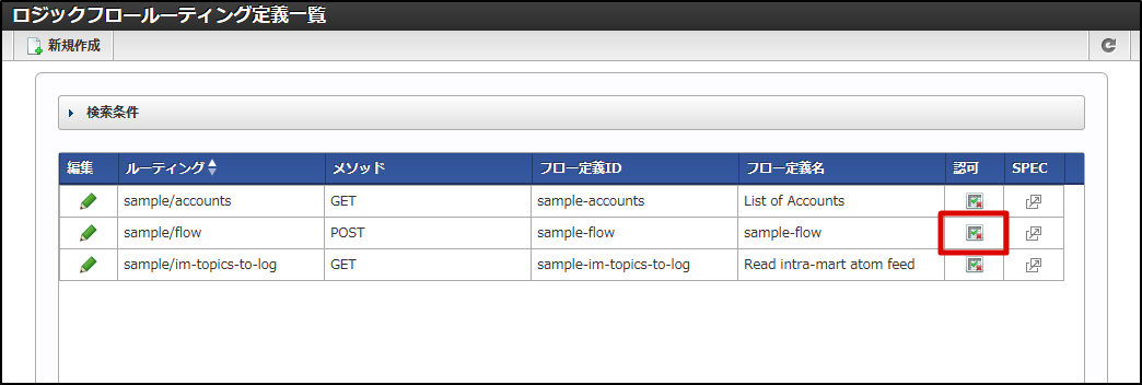 認可を行うフロールーティングの列にある「認可」アイコン(