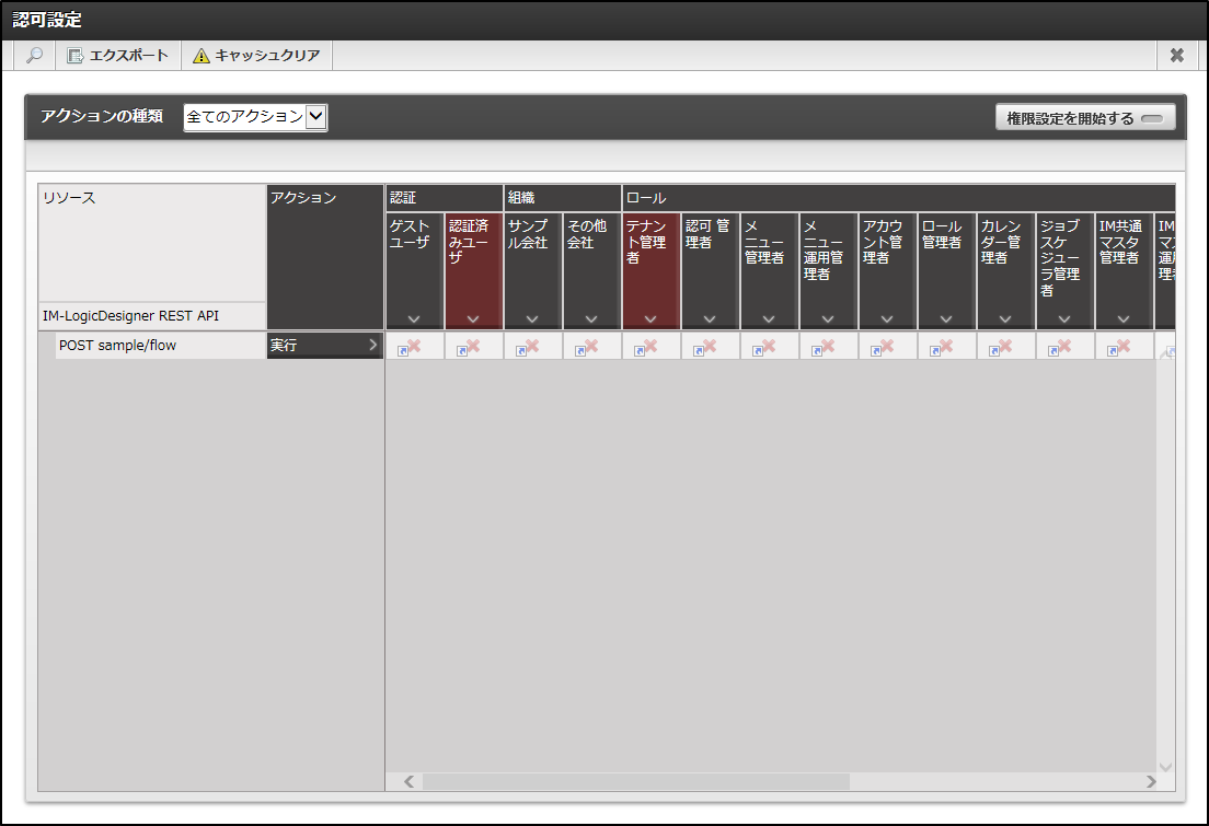 )をクリックします。対象のフロールーティングの「認可設定」画面が表示されます。