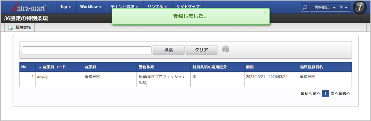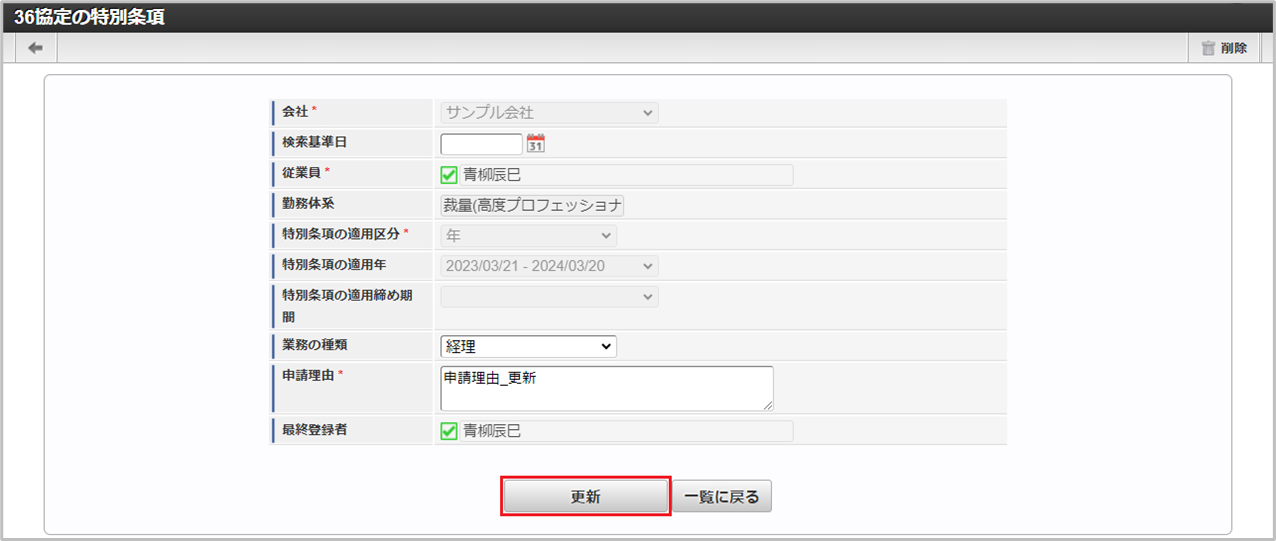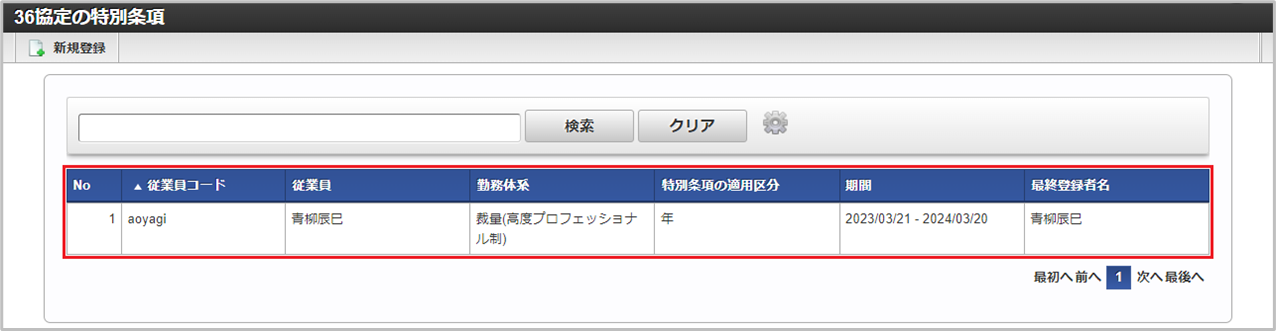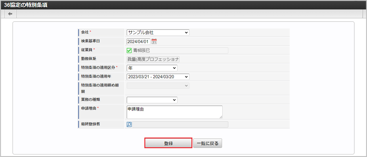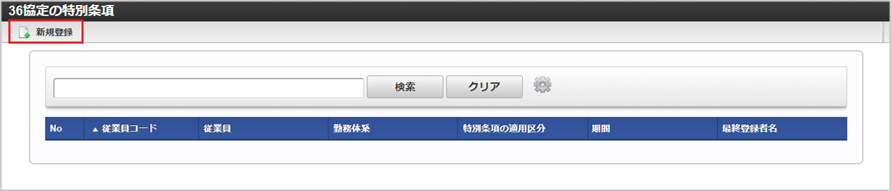 「サイトマップ」→「勤務管理」→「従業員メニュー」→「36協定の特別条項」をクリックします。 一覧画面表示後、「新規登録」をクリックします。 登録/更新画面で必要な情報を入力し、「登録」をクリックします。
