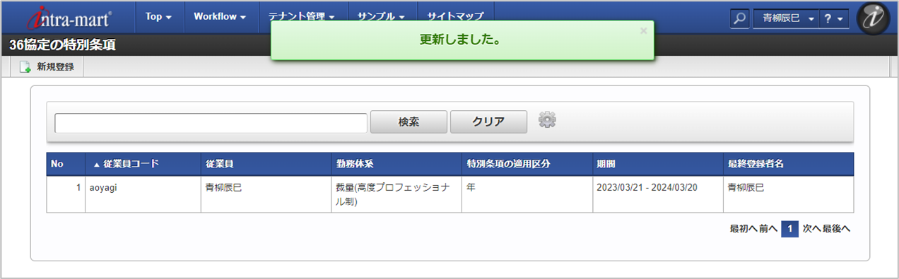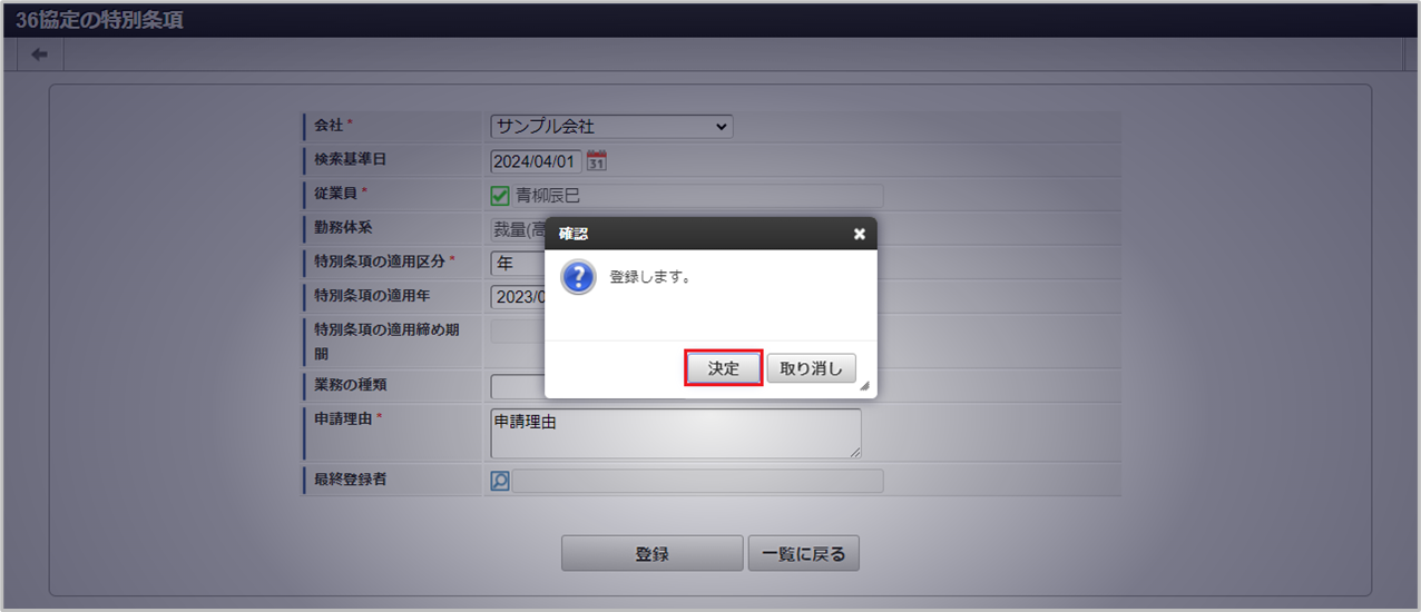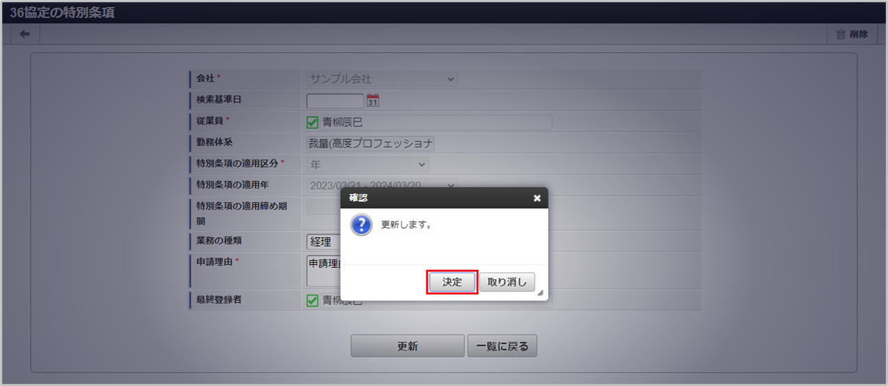 従業員 勤務体系 特別条項の適用区分 特別条項の適用年 特別条項の適用締め期間 最終登録者 確認ポップアップが表示されますので、「決定」をクリックします。 更新することができました。