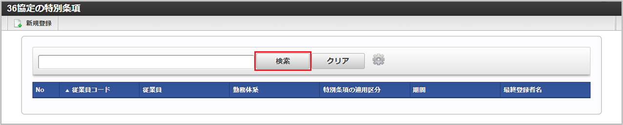 「サイトマップ」→「勤務管理」→「従業員メニュー」→「36協定の特別条項」をクリックします。 一覧画面で「検索」をクリックします。コラム