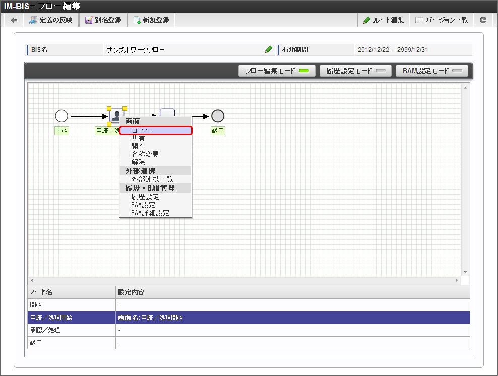 「IM-BIS - フロー編集」画面でコピー元のノードを右クリックします。