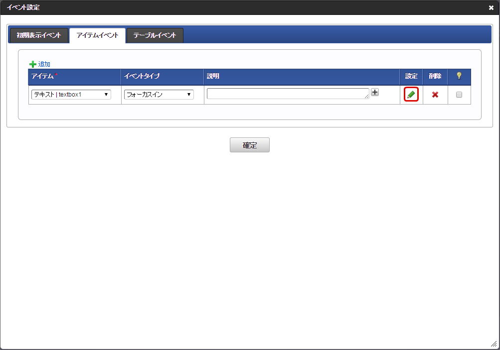 画面上の特定の画面アイテム(入力・選択系アイテム)への操作(イベント)のタイミングでアクション「入力モード変換」を実行するためには、以下の手順で設定します。