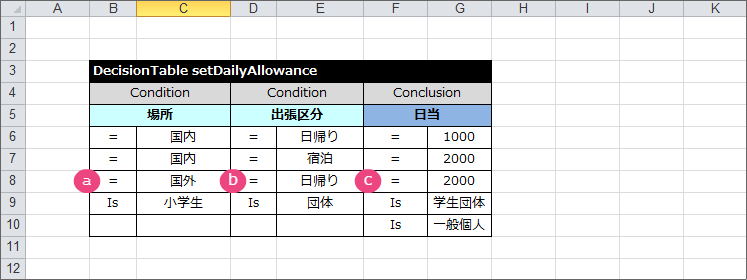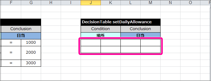 テーブル名キーワード DecisionTable から半角スペースを空けて「setDailyAllowance」と入力してください。 条件の項目の論理名(1)「場所」と入力してください。 条件の項目の論理名(2)「出張区分」と入力してください。 結果の項目の論理名「日当」と入力してください。 これで、 DecisionTable の項目が設定できましたので、各行に条件と評価を入力していきましょう。