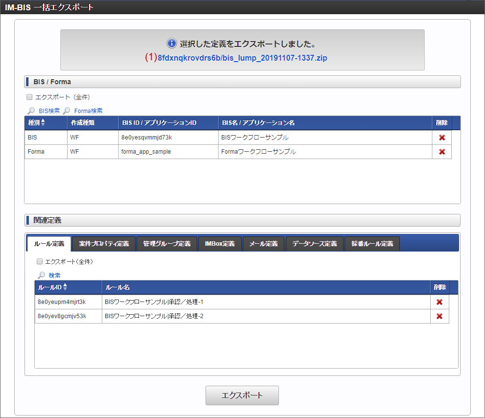なお、BIS定義、Formaアプリケーション、または関連定義のみを選択してエクスポートもできます。