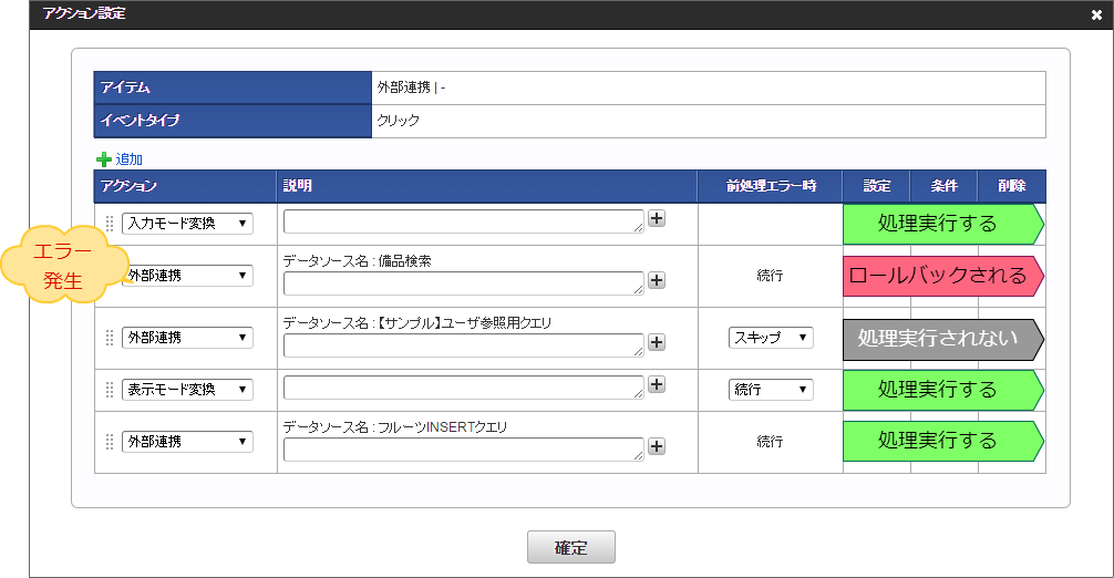- スキップ→直前の外部連携処理の結果がエラーとなった場合、処理をスキップします。