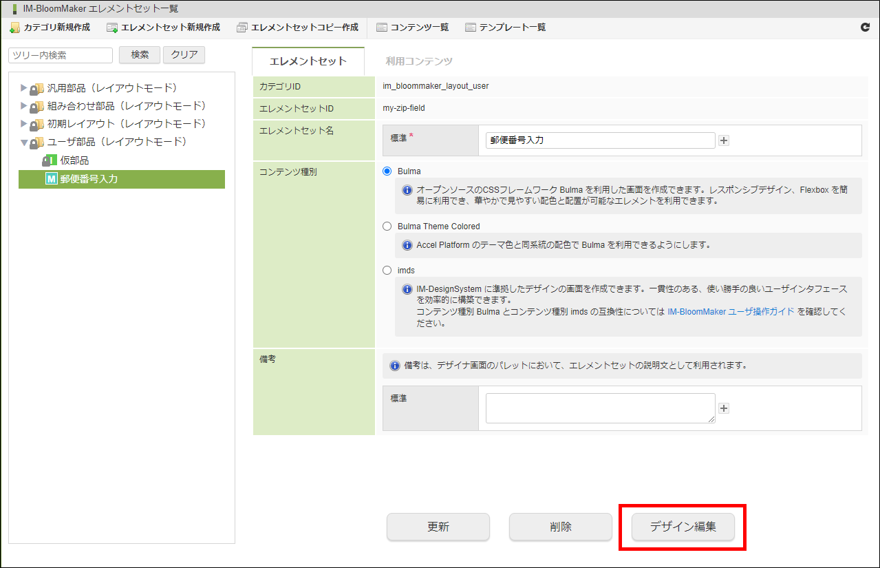 「サイトマップ」→「BloomMaker」→「エレメントセット一覧」から、「エレメントセット一覧」画面を開きます。エレメントセットカテゴリから「ユーザ部品(レイアウトモード)」を選択します。