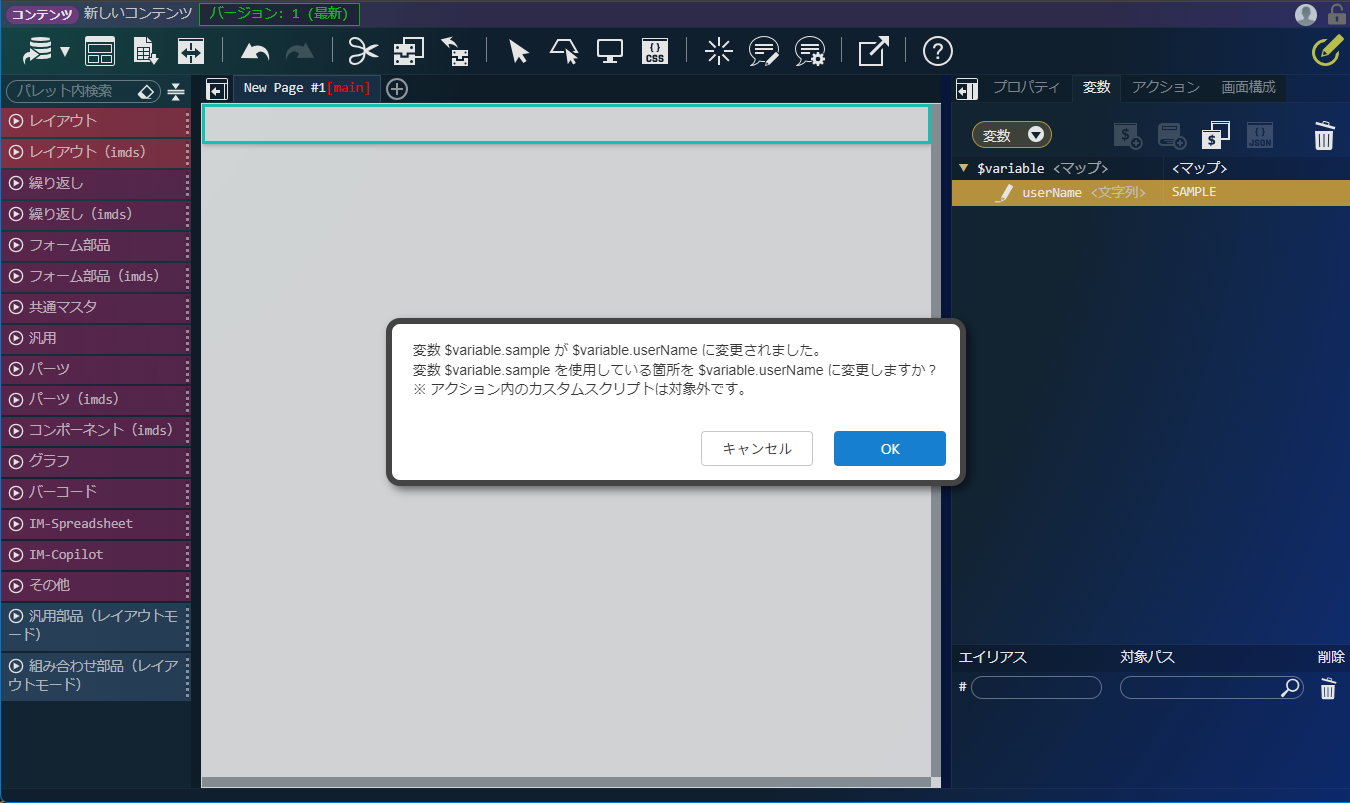 変数、定数、入力、または多言語のキー名を変更した後、変更前のキー名がすでに使用されている箇所がある場合、自動的に修正する旨の確認ダイアログが表示されます。