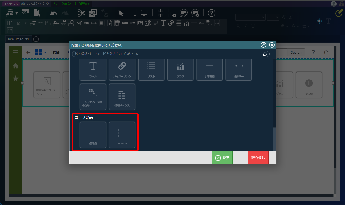 配置したい部品のパネルをクリックし、ダイアログの「決定」ボタンをクリックします。