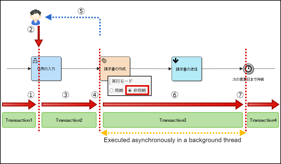 待機を伴うアクティビティに該当しないアクティビティでも、非同期実行オプションが設定されている場合、トランザクションの開始/終了の境界地点として扱われます。