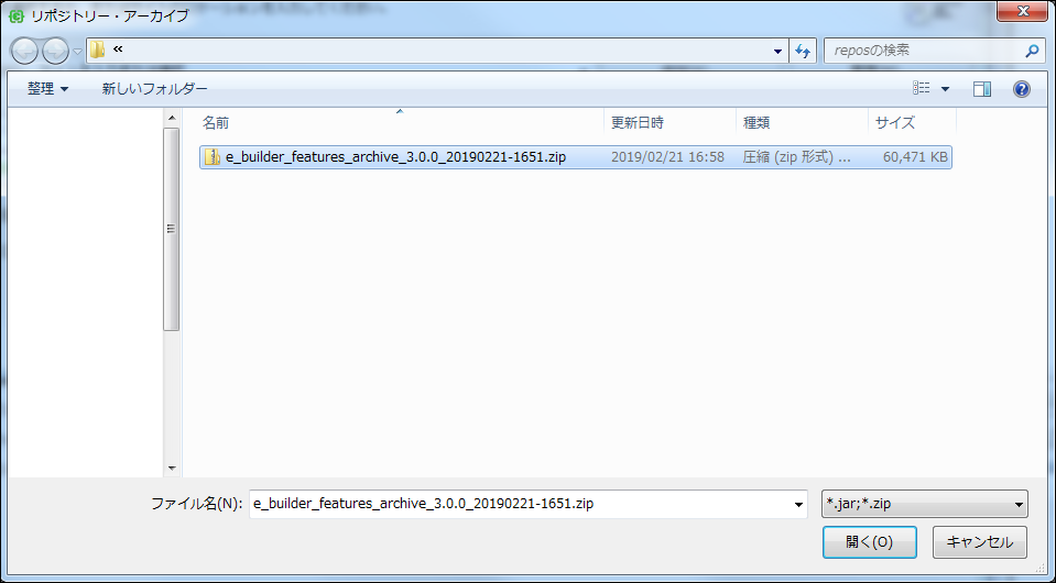 • 「ファイル選択」画面が表示されますので、対象のアーカイブファイルを選択します。