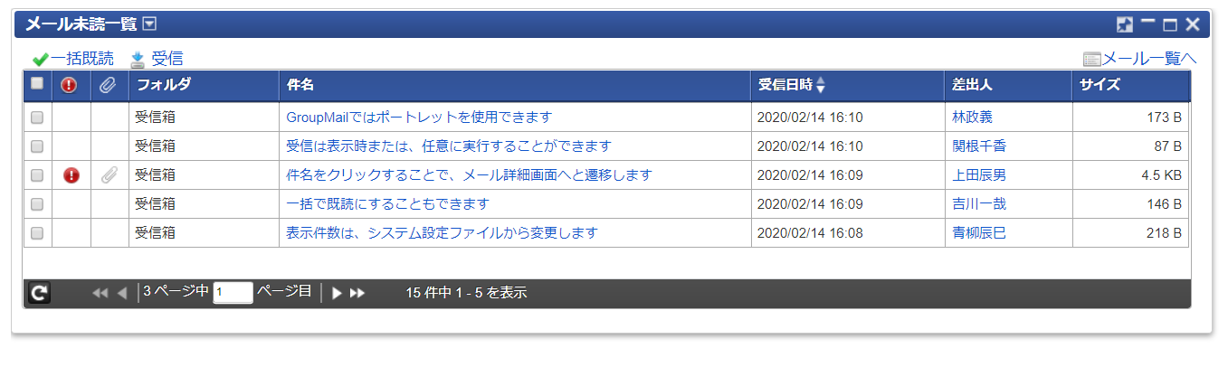 メール未読一覧ポートレットの表示件数は、システム設定ファイルの設定に従います。