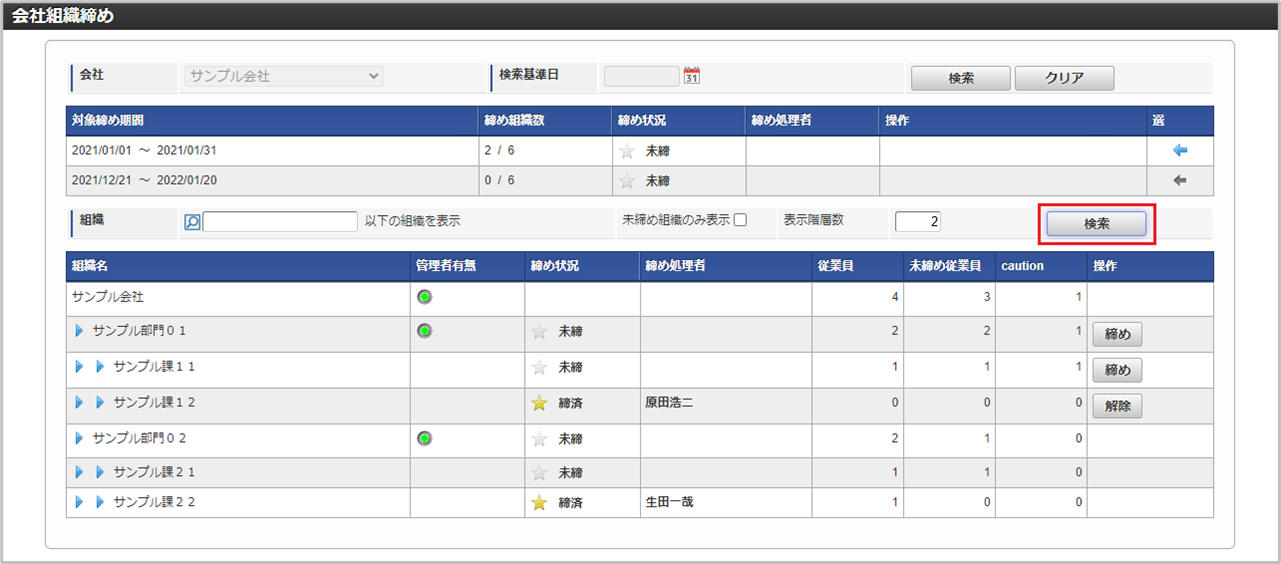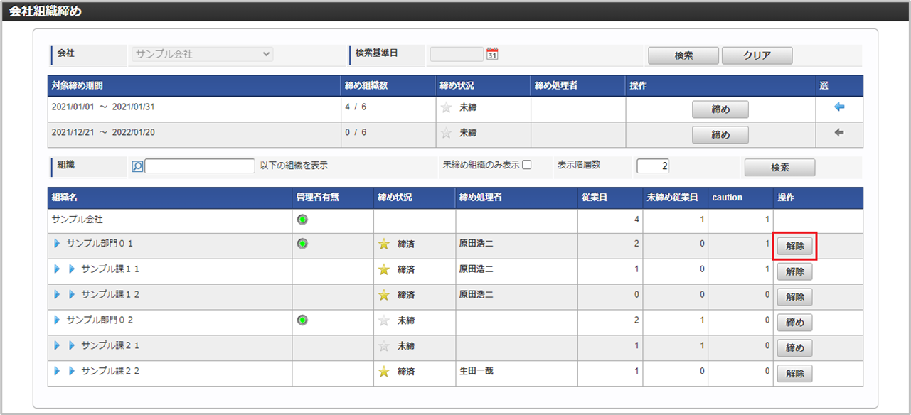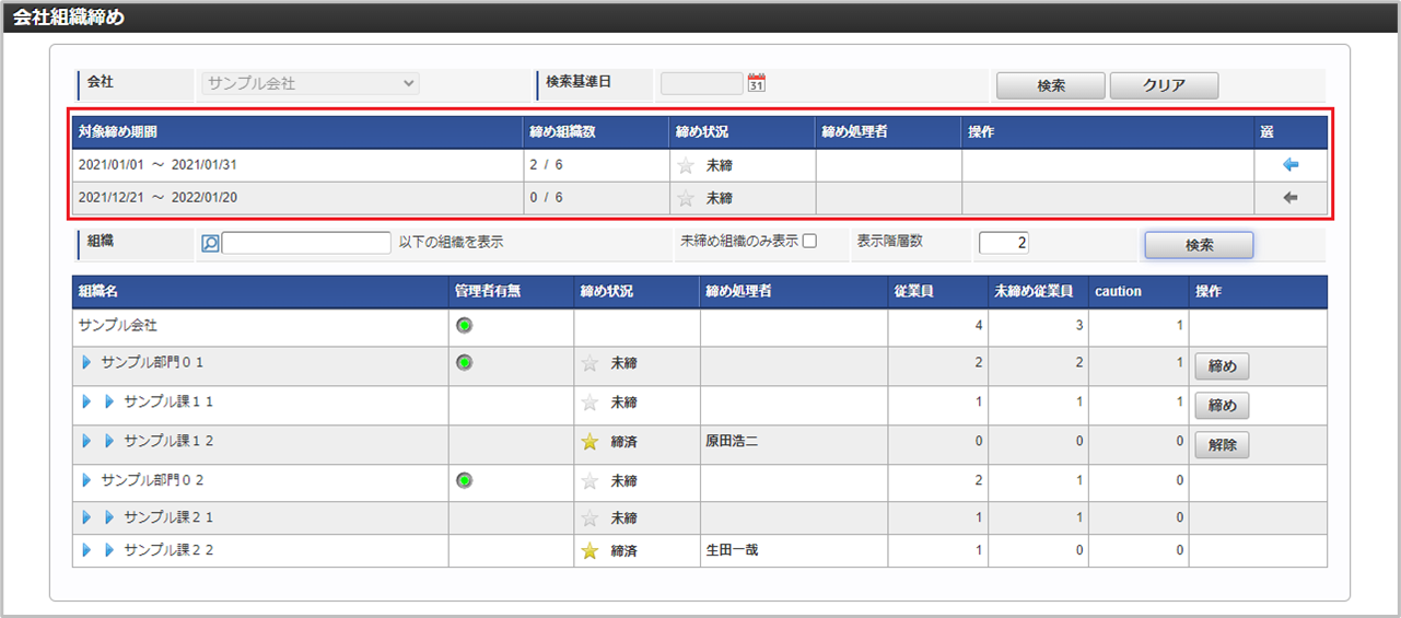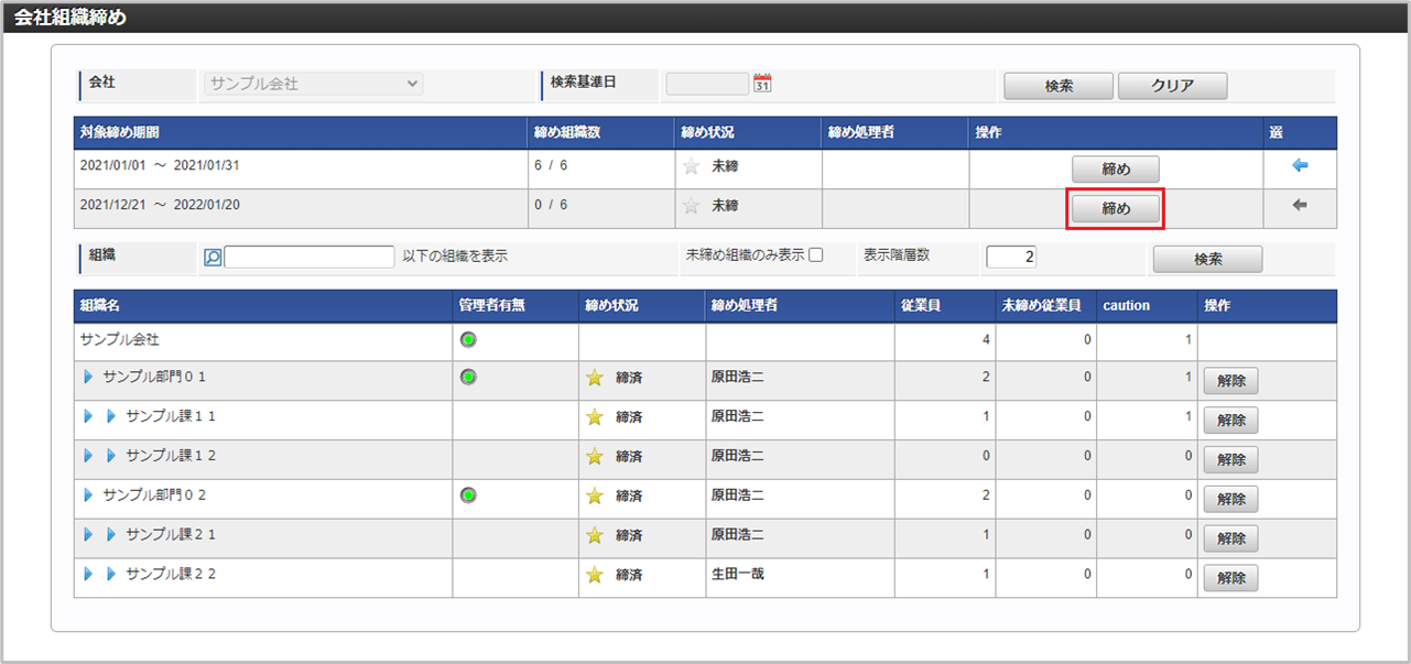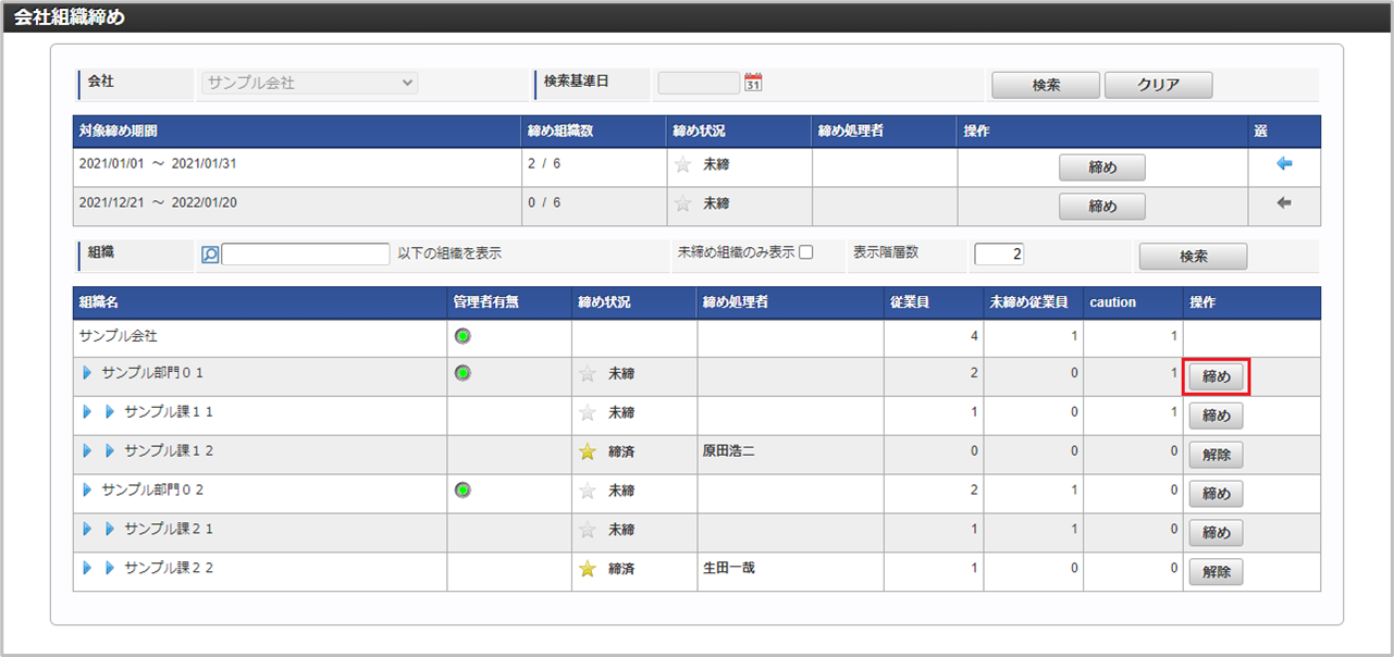 本項では、組織単位の締め処理方法を説明します。人事権限を付与されたユーザは、人事権限を付与された会社のすべての組織に対して締め処理が可能です。管理者権限を付与されたユーザは、管理者権限を付与された組織とその配下組織に対して締め処理が可能です。