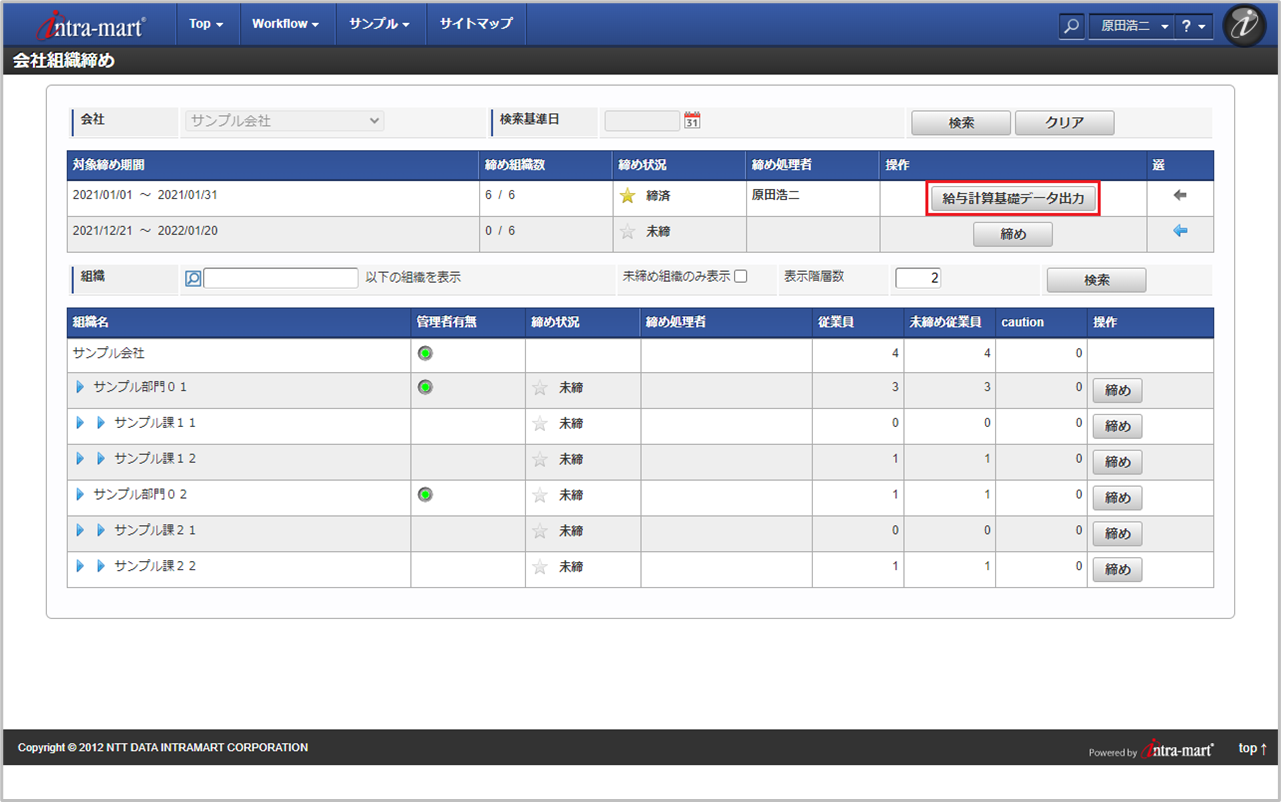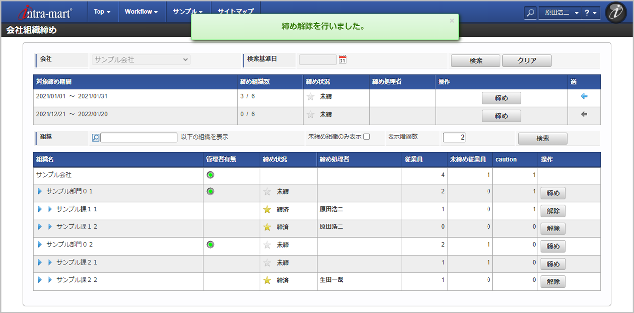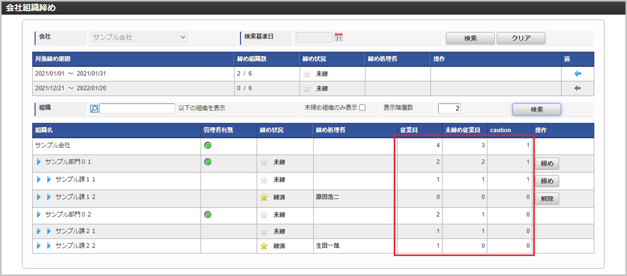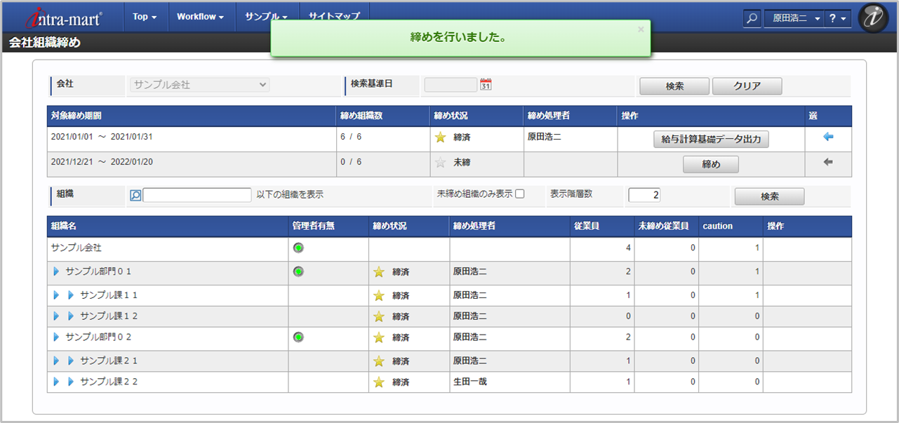 本項では、組織単位の締め処理方法を説明します。人事権限を付与されたユーザは、人事権限を付与された会社のすべての組織に対して締め処理が可能です。管理者権限を付与されたユーザは、管理者権限を付与された組織とその配下組織に対して締め処理が可能です。