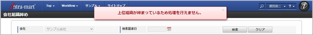 組織一覧を表示している場合は、検索条件を変更できません。変更する場合は一度検索条件を初期化(クリアボタンをクリック)してください。 会社の締め期間が表示されます。検索した会社に複数の締め期間がある場合は、複数表示されます。