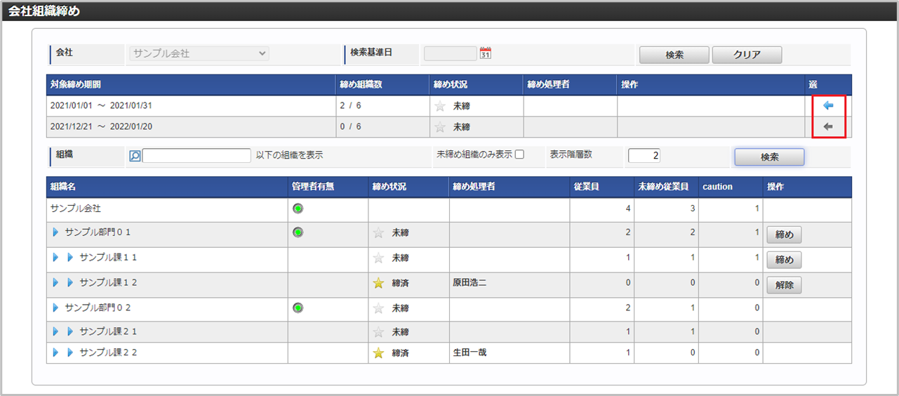 対象締め期間締め処理可能な期間です。 締め組織数締め対象となる組織数です。 締め状況その期間の現在の締め状況です。 締め処理者その期間を締めた処理者名です。 締め期間を変更する場合は、一覧右の矢印をクリックします。