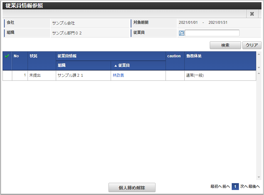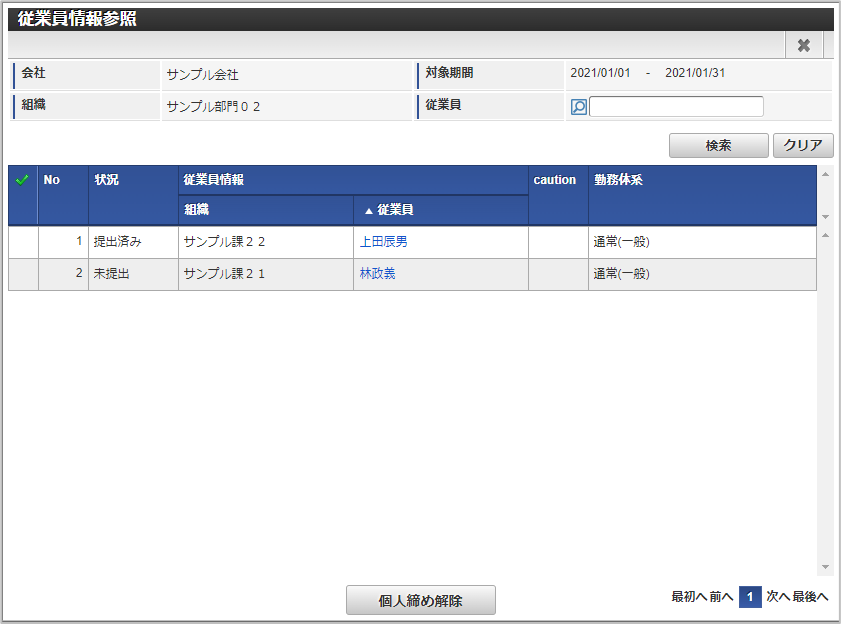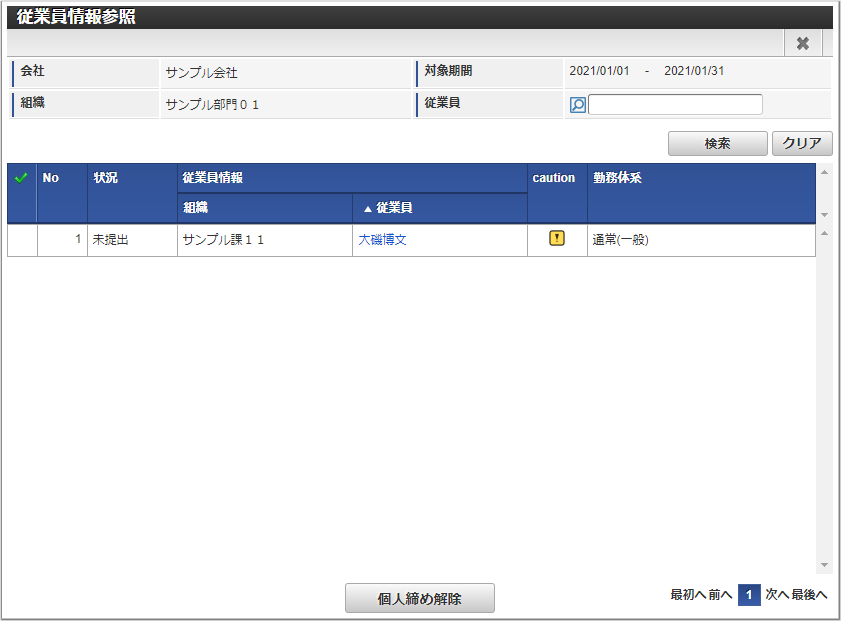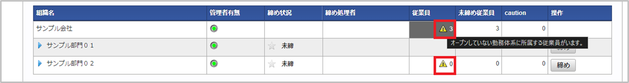 組織名締め対象となる組織です。 管理者有無締め処理者となる組織管理者の有無です。 締め状況その組織の現在の締め状況です。 締め処理者その組織を締めた処理者名です。 従業員その組織に所属する従業員数です。 未締め従業員その組織に所属する従業員のうち、勤務表提出を行っていない従業員数です。 cautionその組織に所属する従業員のうち、勤務表で注意・警告が発生している従業員数です。 管理者権限を保持する組織の次の列をクリックすると、従業員の一覧が表示されます。