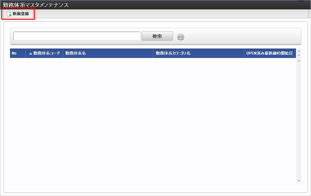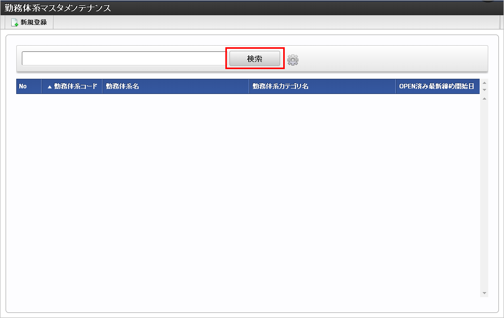 「サイトマップ」→「勤務管理」→「マスタメンテナンス」→「勤務体系」をクリックします。 勤務体系マスタ一覧画面で「検索」をクリックします。コラム