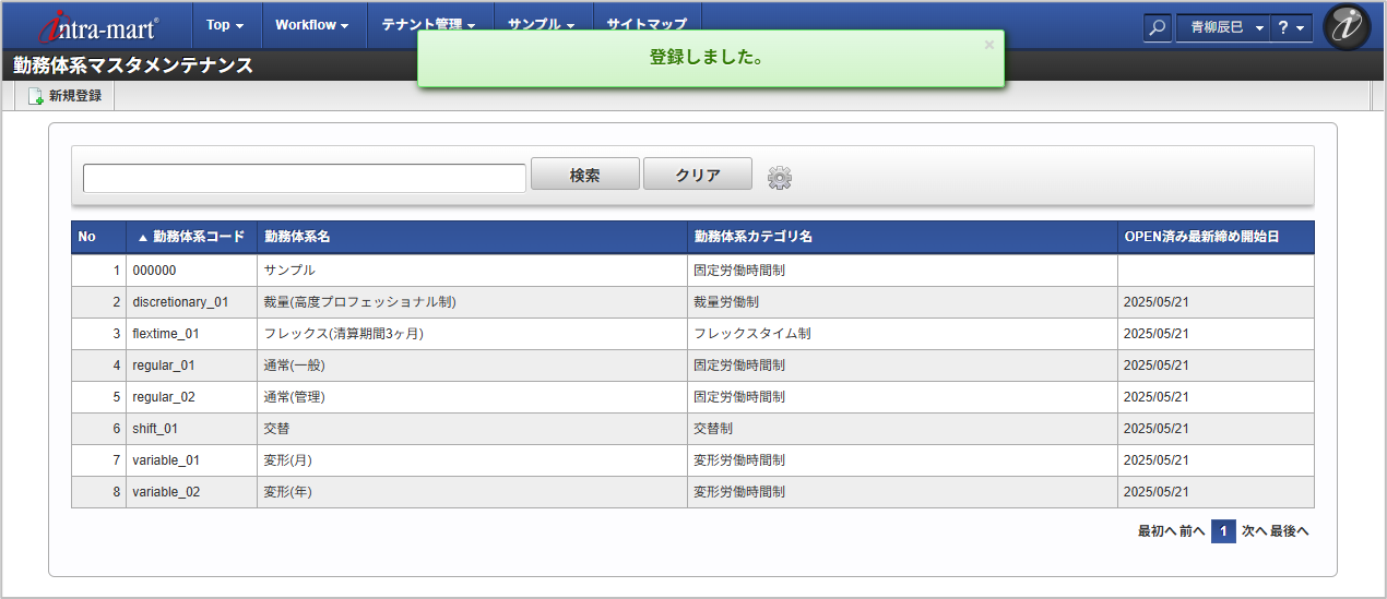 「サイトマップ」→「勤務管理」→「マスタメンテナンス」→「勤務体系」をクリックします。 勤務体系マスタ一覧画面表示後、「新規登録」をクリックします。 勤務体系マスタ登録/更新画面で必要な情報を入力し、「登録」をクリックします。