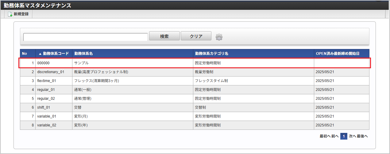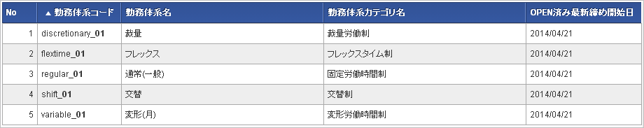 勤務体系コード 勤務体系名 勤務体系マスタ一覧画面の対象データが表示されている行をクリックします。コラム