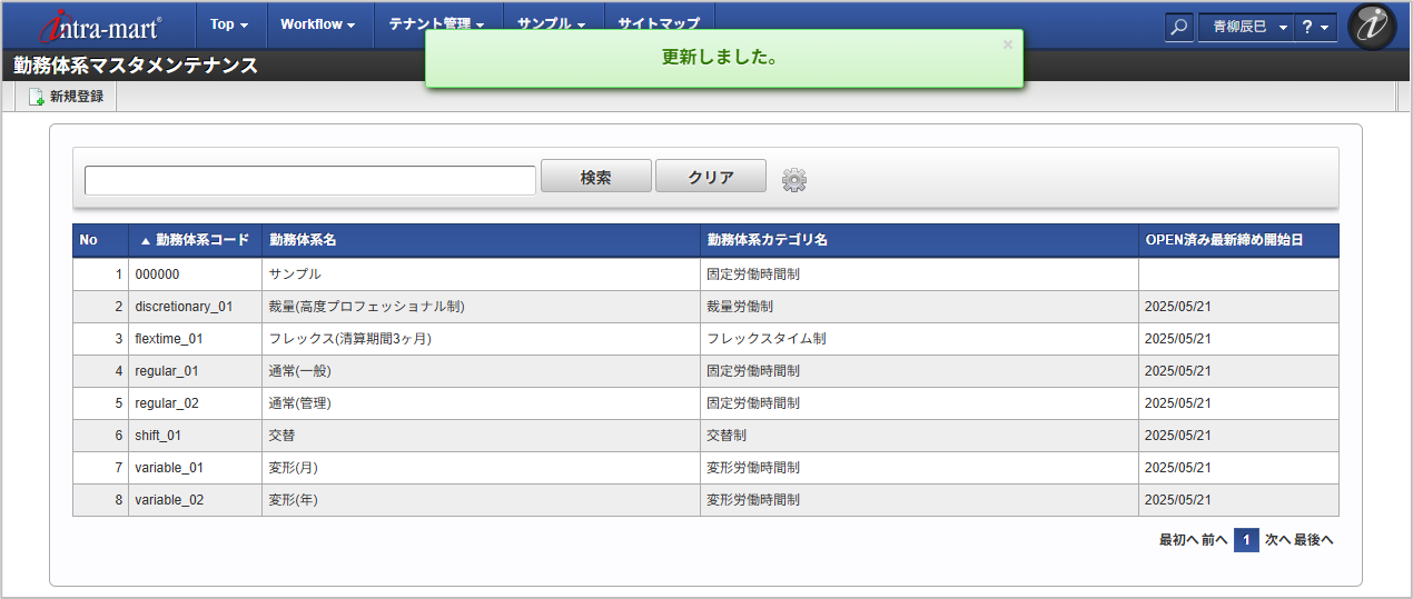 一覧機能の操作方法は、一覧画面の操作を参照してください。 勤務体系マスタ登録/更新画面で情報を編集し、「更新」をクリックします。次の項目は編集不可項目です。