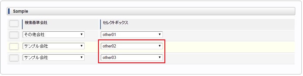 ヘッダー項目(検索基準会社)を選択します。 明細のセレクトボックスを選択します。同様に他のセレクトボックスを選択します。 ヘッダー項目(検索基準会社)を変更します。変更に合わせて明細のセレクトボックスすべてがリフレッシュされ、未選択状態に変更されます。 再度、明細のセレクトボックスを選択すると、ヘッダー項目(検索基準会社)に合わせたリストデータが表示されます。例)同じ明細項目の値変更に合わせて、明細項目をリフレッシュ同じ明細項目の値変更に合わせて明細のセレクトボックス(リストデータ)をリフレッシュする場合は、各リストデータ毎にリフレッシュする必要があります。コラム