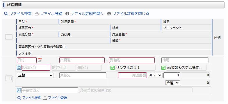 項目名 説明 日付 移動日を入力します。 利用区間 移動の際の出発地と到着地を入力します。 補足 利用区間の補足を入力します。 経費区分 経費区分(勘定科目と税区分の組み合わせ)を選択します。 (勘定科目) 選択した経費区分に紐づく勘定科目を表示します。 (税区分) 選択した経費区分に紐づく税区分を表示します。 組織 費用の計上組織を選択します。 プロジェクト 費用の計上プロジェクトを選択します。 支払分類 支払分類を選択します。 支払先 支払先名称などを入力します。 片道金額(単価) 交通費の通貨額を入力します。 (通貨) 通貨を選択します。 (換算レート) 換算レートを入力します。 (換算額) 片道金額(単価)×換算レートの計算結果を表示します。 金額 往復を加味した金額を表示します。 (乗車種類) 片道/往復を選択します。 連携情報 経路検索を使用してデータを反映した場合、経路情報を表示します。「経路検索」アイコンをクリックすると、経路検索を実施します。連携 ICカードデータ検索ガジェットなどを使用してデータを反映した場合、アイコンを表示します。 事業者区分・交付義務の免除理由 申請書に事業者区分・交付義務の免除理由が含まれている場合に利用できます。インボイス制度の事業者区分、適格請求書交付義務の免除理由を選択します。ファイル 申請書にファイル検索が含まれている場合に利用できます。 コラム