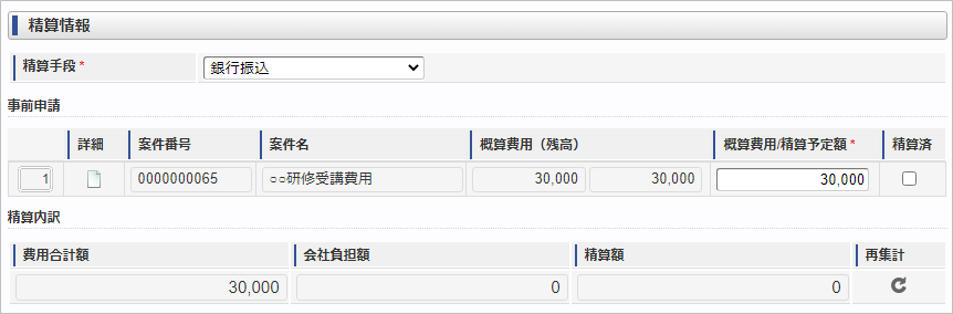 項目名 説明 精算手段 精算が必要な場合の精算手段を選択します。 詳細 関連づけた事前申請書を別画面で表示します。 案件番号 関連づけた事前申請書の案件番号を表示します。 案件名 関連づけた事前申請書の案件名を表示します。 概算費用(残高) 概算費用は、関連づけた事前申請書の概算費用を表示します。概算費用(残高)は、関連づけた事前申請書の概算費用残高を表示します。概算費用/精算予定額 概算費用残高のうち、精算対象とする金額を入力します。 精算済 関連付けた事前申請書を精算済にする場合、チェックします。 精算内訳 精算金額の内訳を表示します。 (費用合計額) 経費明細などに入力された費用の合計を表示します。 (会社負担額額) 経費明細などに入力された費用のうち、「立替」でない金額の合計を表示します。 (精算額) 費用合計額 - 会社負担額 - 概算費用/精算予定額の計算結果を表示します。再集計 費用合計額・会社負担額・精算額を再計算します。 注意
