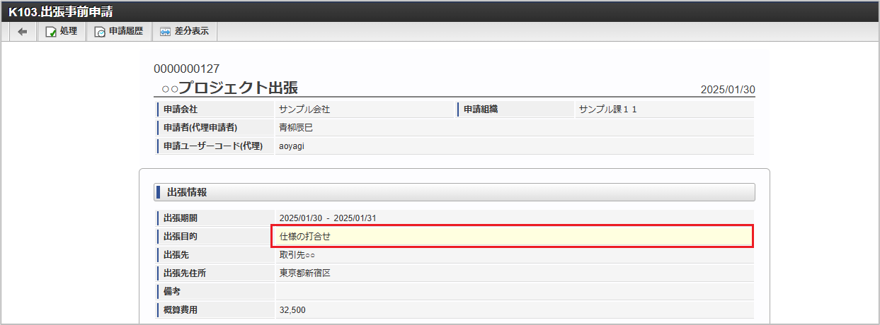 差分表示を利用するには 「intra-mart Accel Kaiden! IM-Workflow連携モジュール」のモジュール設定が必要になります。詳細は『intra-mart Accel Kaiden! セットアップガイド』-「WARファイルの作成」-「Kaiden! の設定ファイル」-「intra-mart Accel Kaiden! IM-Workflow連携モジュール」-「モジュール設定」を参照ください。 申請時のデータと内容に差分のある場合、該当項目の背景色が変更されます。コラム