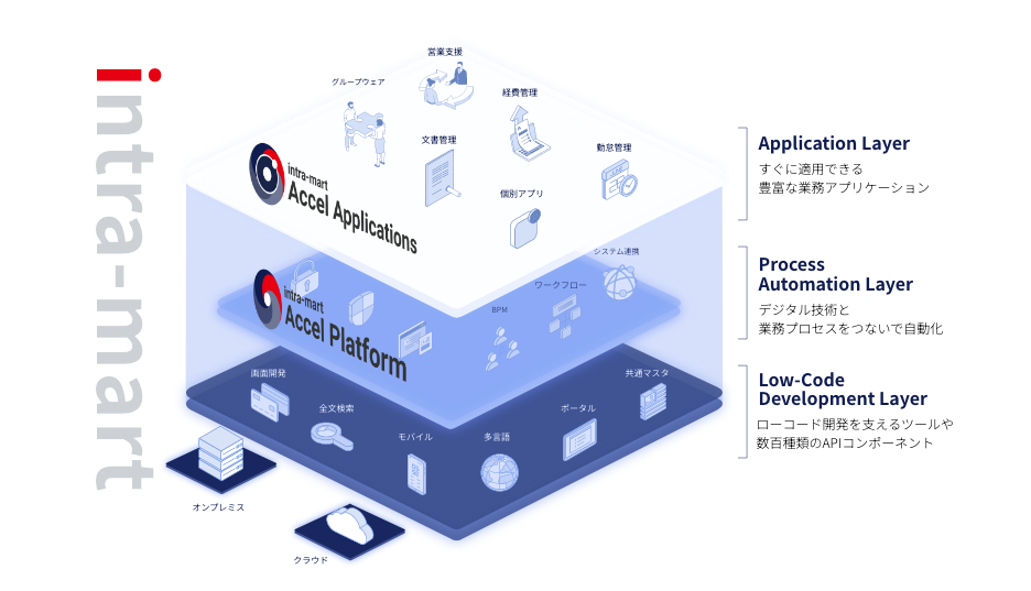 「intra-mart」は、企業特有のニーズにあわせたカスタマイズのしやすいOpenな開発環境と、全社員がすぐに使えるEasyさを備えた、エンタープライズ・ローコードプラットフォームです。