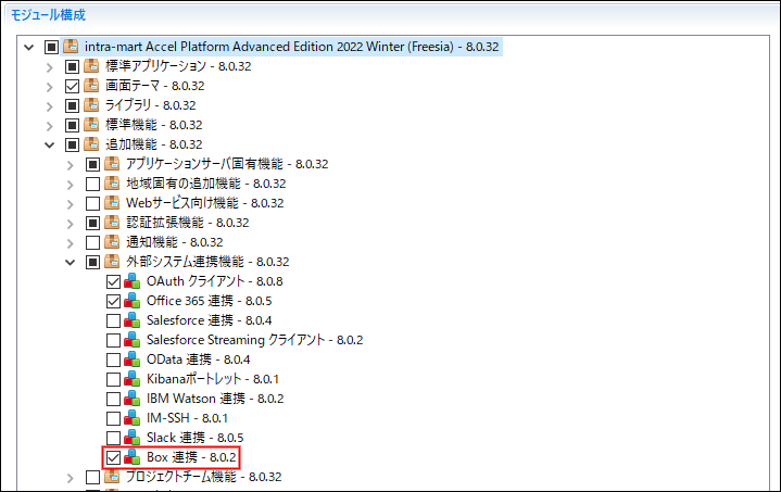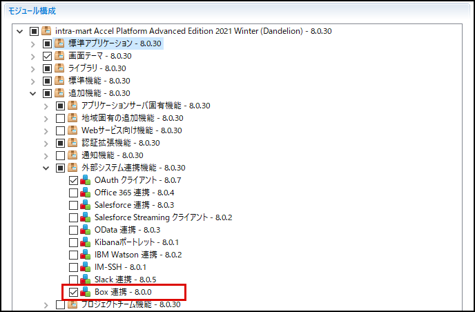 追加機能より「Box 連携」モジュールを選択し WARファイルを作成します。このとき、「Box 連携」のバージョンが8.0.2以降であることを確認します。