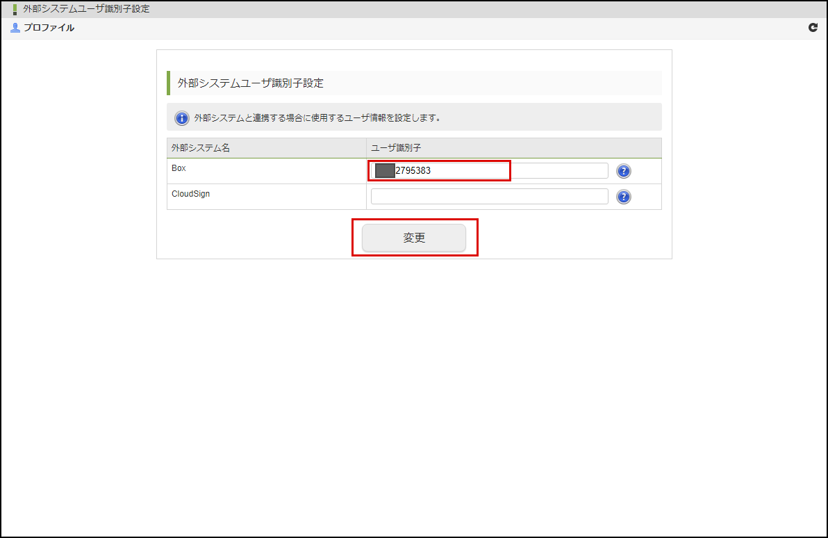 外部システム名が「Box」の行の「ユーザ識別子」に連携先のBoxユーザIDを貼り付けて「変更」ボタンをクリックします。