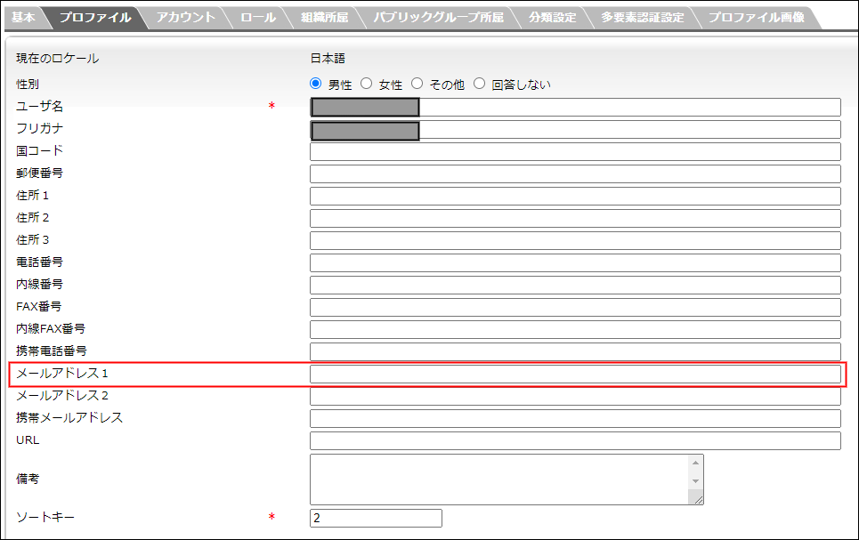 - ユーザプロファイルの「メールアドレス1」が空欄であるユーザ