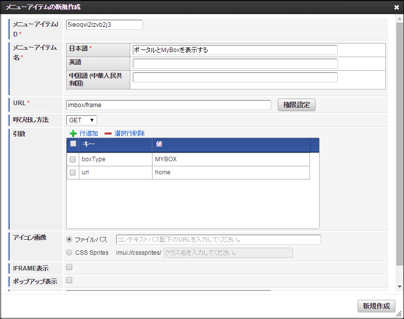 IMBoxFrame を表示するメニューに登録する例は以下の通りです。以下の例ではメニューアイテムの設定のみ記載していますが、必要に応じてメニューグループの追加や、認可の設定を行ってください。コラム