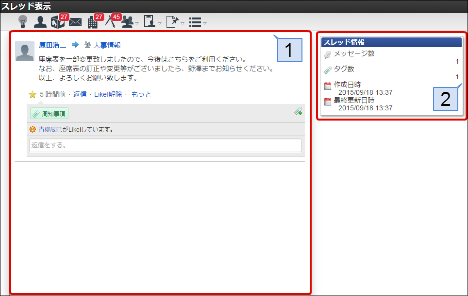 タイムラインに投稿された内容を単一のページで表示する画面です。 投稿内容はスレッド形式で表示されます。