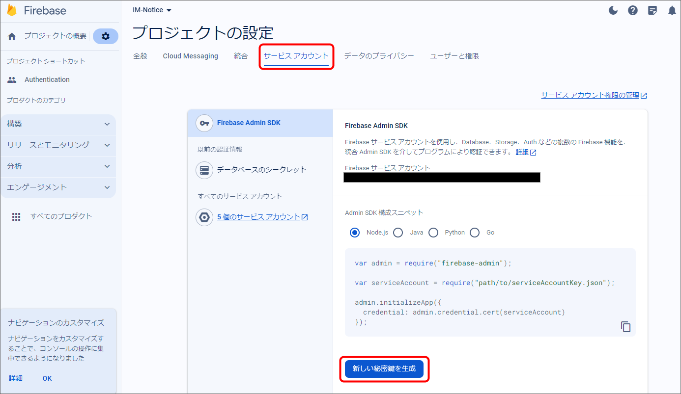 Firebase Console にログインしてください。 対象のプロジェクトをクリックしてください。 プロジェクト概要の歯車アイコンをクリックし、「プロジェクトを設定」をクリックしてください。 「Cloud Messaging」タブをクリックし、Firebase Cloud Messaging API(V1)が有効であることを確認してください。無効だった場合は有効にしてください。 「サービスアカウント」タブを選択し、「新しい秘密鍵を生成」をクリックしてください。 表示されたメッセージを確認し、「キー生成」をクリックしてください。秘密鍵が生成されると、JSON 形式のサービスアカウントの認証情報ファイルがダウンロードされます。設定ファイルを編集する際に、設定ファイルと同じディレクトリに配置する必要がありますので、保持しておいてください。 IM-Juggling の <(プロジェクト名)/conf> 配下に出力された im-notice-mobile-config.xml を開き、<server-key> を削除して <credentials-file> を追加してください。<credentials-file> には、ダウンロードした JSON 形式のサービスアカウント認証情報ファイルのファイル名を設定してください。認証情報ファイルを im-notice-mobile-config.xml と同じディレクトリに配置してください。また、<url> には https://fcm.googleapis.com/v1/projects/%REPLACE_WITH_PROJECT_ID%/messages:send を設定してください。ただし、%REPLACE_WITH_PROJECT_ID% はFirebaseプロジェクトのプロジェクトIDに置き換えて設定してください。<fcm name="fcm"> <url>https://fcm.googleapis.com/v1/projects/xxxxxxxxxxxx/messages:send</url> <project-id>xxxxxxxxxxxx</project-id> <application-id>xxxxxxxxxxxx</application-id> <api-key>xxxxxxxxxxxx</api-key> <!-- <server-key>xxxxxxxxxxxx</server-key> --> <credentials-file>xxxxxxxxxxxx.json</credentials-file> <sender-id>xxxxxxxxxxxx</sender-id> </fcm> WAR ファイルを出力して再デプロイすることで、FCM HTTP v1 API への移行が完了します。WAR ファイルの出力に関しては「WARファイルの出力」を、再デプロイに関しては「WARファイルの再デプロイ」を参照してください。