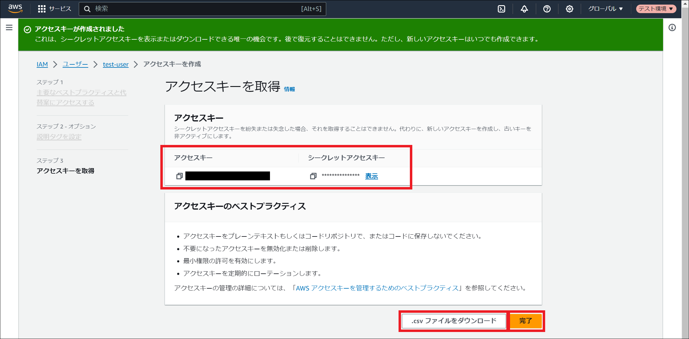 AWS Identity and Access Management (IAM) にサインインしてください。 「ユーザー」を選択し、「ユーザーの作成」を押下してください。 「ユーザー名」に任意のユーザー名を入力し、「次へ」を押下してください。 「許可のオプション」にて「ポリシーを直接アタッチする」を選択してください。その後、 ポリシーの作成 で作成したポリシー名にチェックを入れ、「次へ」を押下してください。 「ユーザーの作成」を押下してください。 作成したユーザー名を押下してください。 「セキュリティ認証情報」タブを押下し、「アクセスキー」にて「アクセスキーを作成」を押下してください。 「コマンドラインインターフェイス (CLI)」を選択し、「上記のレコメンデーションを理解し、アクセスキーを作成します。」にチェックを入れ、「次へ」を押下してください。 「アクセスキーを作成」を押下してください。 「アクセスキーを取得」画面でアクセスキーとシークレットアクセスキーを控えるか、「.csv ファイルをダウンロード」を押下してください。その後、「完了」を押下してください。