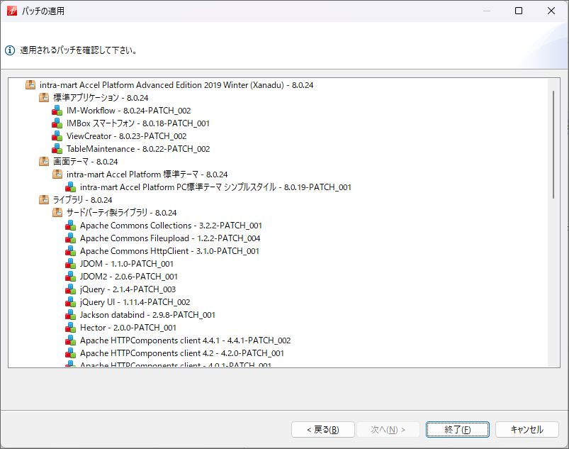適用するパッチ内容を確認し「終了(E)」をクリックします。