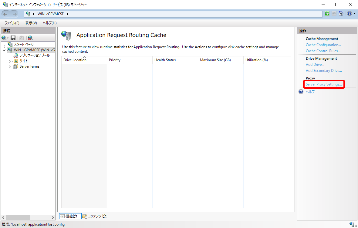 web.config の詳細は以下のリファレンスを参照してください。 インターネット インフォメーション サービス (IIS) マネージャー より「IIS サーバ」「Application Request Routing Cache」「機能を開く」の順にクリックします。 「Server Proxy Settings...」をクリックし、「Application Request Routing」画面を表示します。 「Enable Proxy」をチェックし、「Time-out (seconds)」にタイムアウト値を秒単位で設定します。「Reverse rewrite host in response headers」のチェックを外します。統合Windows認証機能を利用していない場合、「Keep alive」のチェックを外します。さらに、「適用」をクリックし、設定を反映します。注意