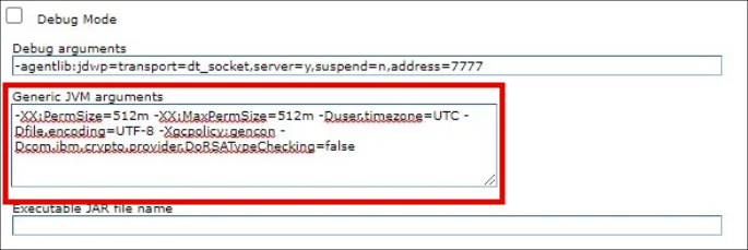 -XX:PermSize Permanent領域の初期値 -XX:MaxPermSize Permanent領域の最大値 -Duser.timezone Javaランタイム システムプロパティのタイムゾーン -Dfile.encoding Javaランタイム システムプロパティのファイルエンコーディング -Xgcpolicy:gencon ガーベッジ・コレクション・ポリシー -Dcom.ibm.crypto.provider.DoRSATypeChecking 秘密鍵による RSA 暗号化および公開鍵による復号化を許可するかどうかを指定します。カスタマーサクセスライセンスを利用する場合は、false を指定してください。下記ではPermanent領域の初期値に512MB、最大値に512MBを設定しています。