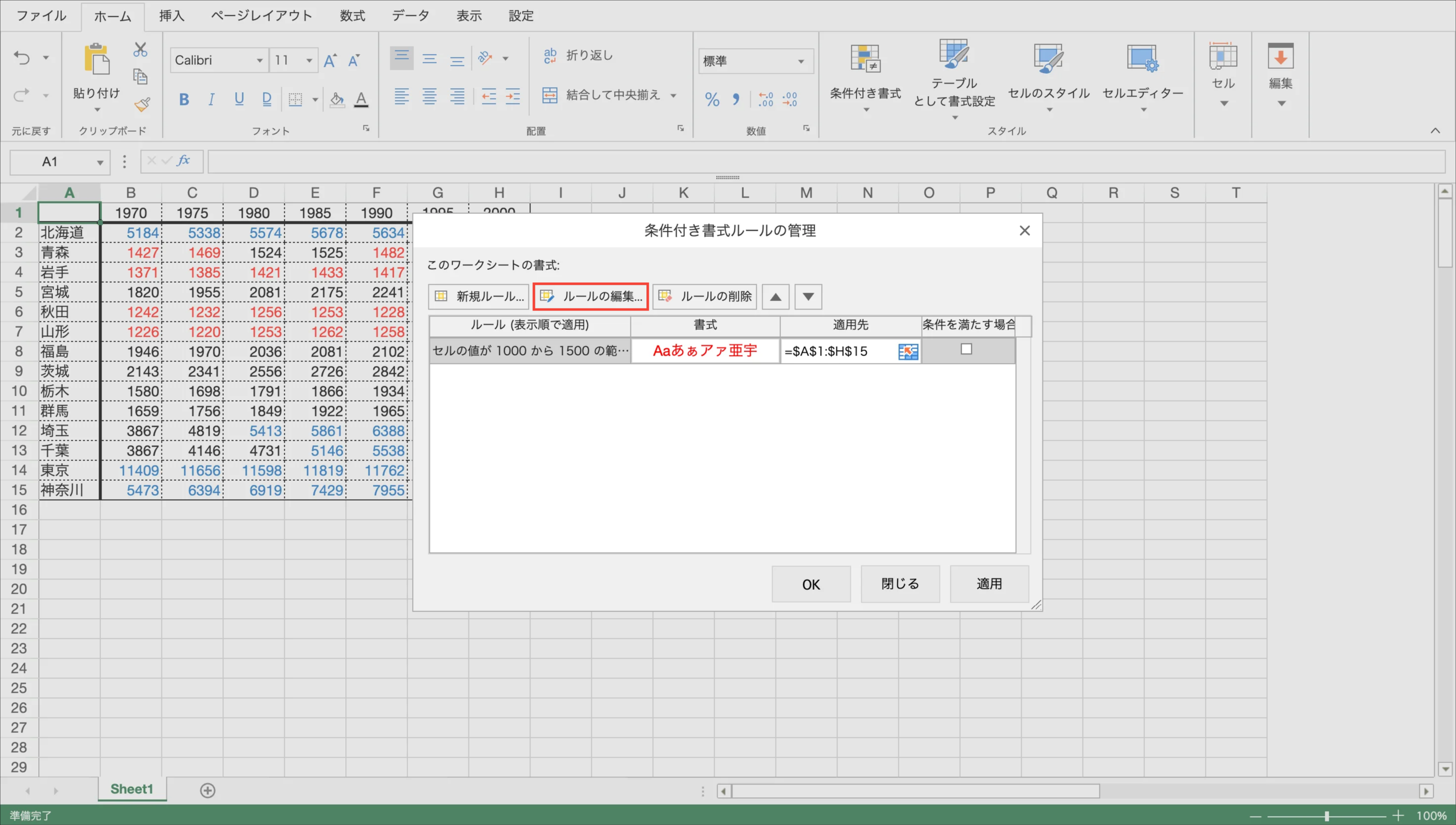 条件付き書式ルールの管理ダイアログ内のルールの編集ボタンをクリックします。