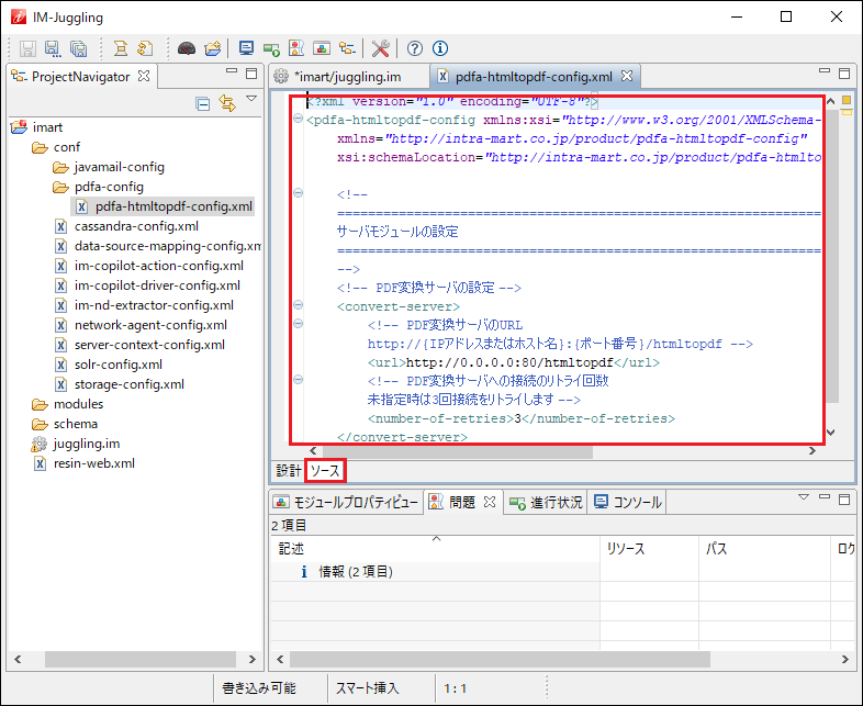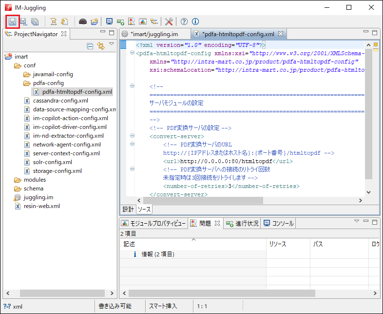 項目名 説明 必須/任意 初期値 <convert-server> PDF変換サーバ に関する設定 必須 ― /<url> PDF変換サーバ のアドレス 必須 http://0.0.0.0:80/htmltopdf /<number-of-retries> PDF変換サーバ への接続のリトライ回数 任意 3 「保存」アイコンをクリックし、保存します。