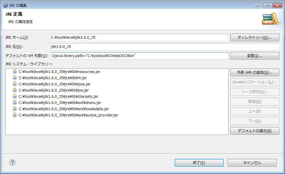 「デフォルトのVM引数」に、次のように< %IOWEBDOC_HOME% /bin >を指定します。