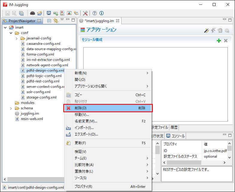 モジュール ファイル名 FullPack版 Web版帳票デザインツール イントラマート連携 pdfd-design-config.xml FullPack版 IM-LogicDesigner 連携 pdfd-logic-config.xml REST Service pdfd-rest-config.xml 削除の確認メッセージが表示されるので、「OK」をクリックします。