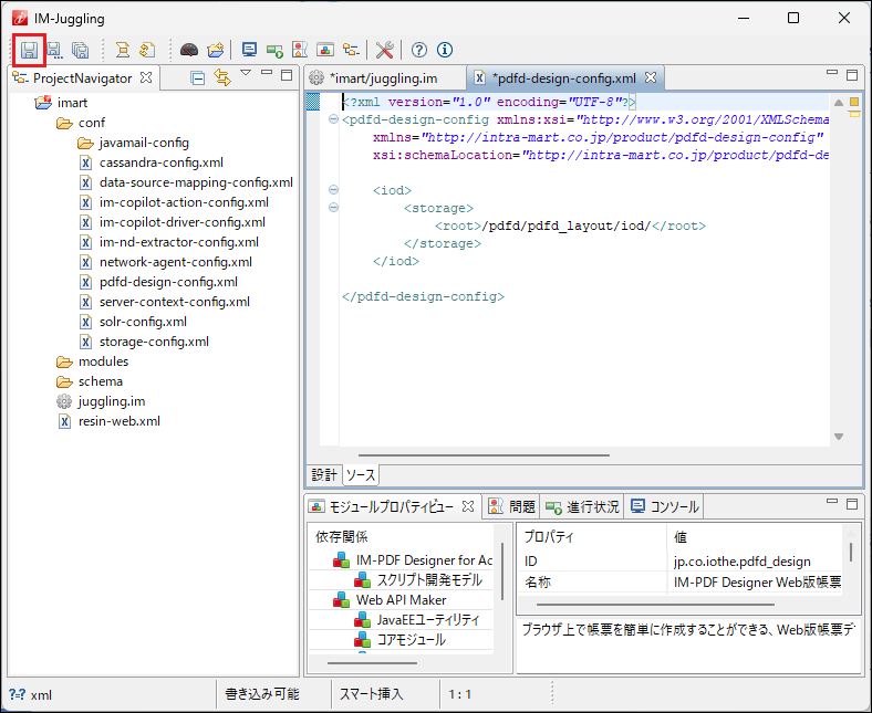4. 「ソース」タブをクリックし、環境に合わせて< pdfd-design-config >内の設定を編集します。