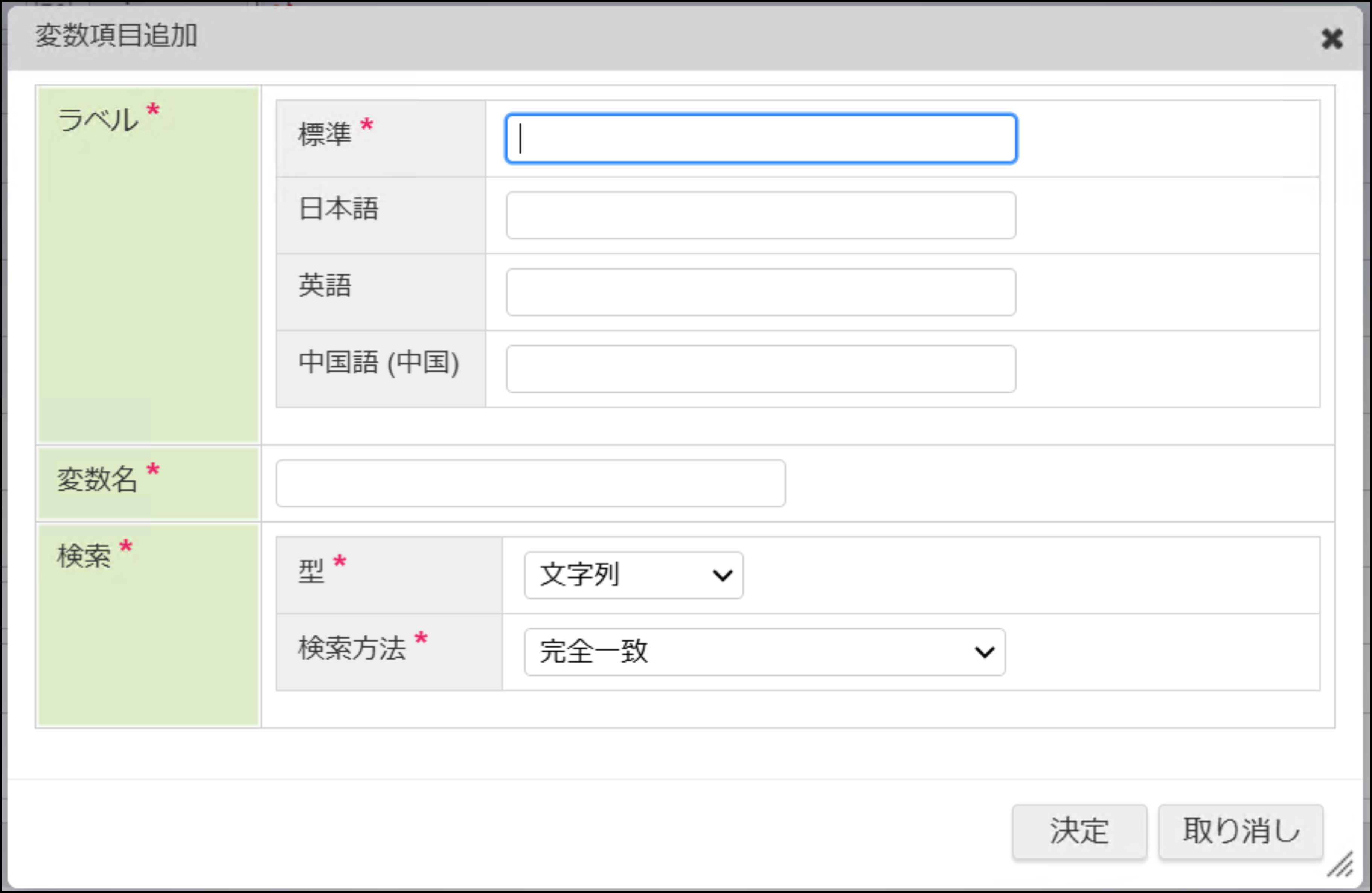 項目名 説明 ラベル 検索項目または一覧表示項目に表示されるラベルを設定します。ラベルは国際化に対応しています。ユーザのロケールに合わせたラベルが利用されます。変数名 検索する変数名を設定します。検索 型 検索対象の変数の型を設定します。文字列、整数、長整数、浮動小数点数、日付、日時、真偽値を選択できます。検索 検索方法 検索する条件の検索方法を設定します。型により選択肢が変わります。文字列:完全一致、完全一致(大小区分なし)、部分一致、部分一致(大小区分なし)整数:完全一致、入力値を含む範囲(以上、以下)、 入力値を含まない範囲(超過、未満)長整数:完全一致、入力値を含む範囲(以上、以下)、 入力値を含まない範囲(超過、未満)浮動小数点数:完全一致、入力値を含む範囲(以上、以下)、 入力値を含まない範囲(超過、未満)日付:完全一致、入力値を含む範囲(以上、以下)、 入力値を含まない範囲(超過、未満)日時:入力値を含む範囲(以上、以下)、 入力値を含まない範囲(超過、未満)真偽値:完全一致